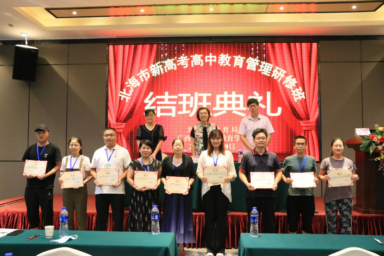 在结班典礼上,北海国际学校吕鑫老师和北海市外国语实验学校的刘鸥老师作为学员代表做了简要发言,两位老师表示在本次培训中收获颇丰,对今后如何适应新高考改革的育人方式有了更加深刻的认识,对所有专家、教师和工作人员表示衷心地感谢。广西师范大学教育学部副部长、广西基础教育研究院副院长、博士生导师叶蓓蓓教授做总结:祝贺各位老师完成研修,希望各位老师在今后的教育教学管理中学以致用,敢于改革,面向未来,勇挑重责,将培训期间所学所思带回各自的工作岗位,凝聚力量,转知为智,随着广西新高考改革的步伐稳步向前。