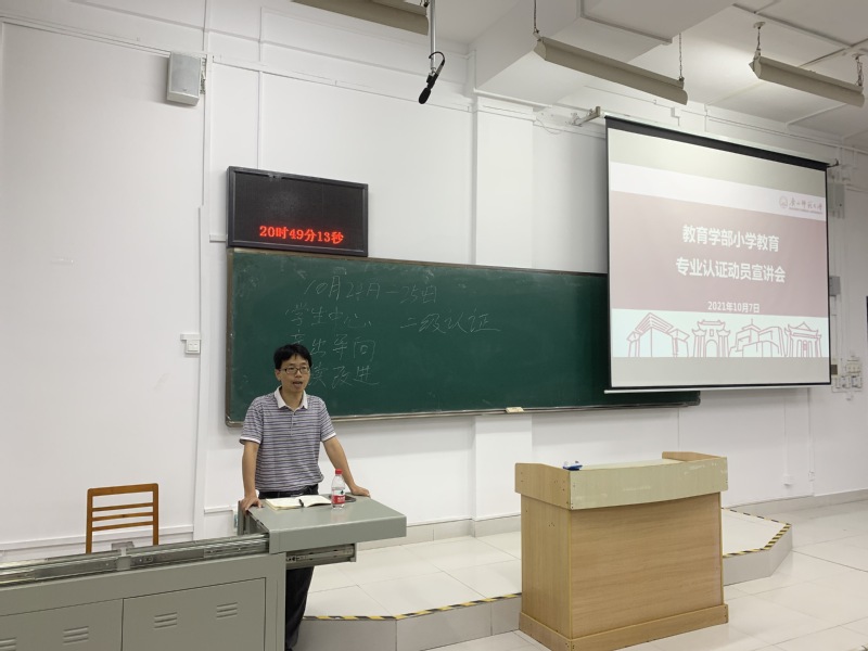 为做好小学教育专业认证工作,2021年10月7日,教育学部在文四区302教室召开小学教育专业认证宣讲会,教育学部副部长李广海作宣讲动员,辅导员彭飞燕、倪秋奕以及小学教育专业全体在校生参加会议,学部党委副书记朱伟军主持会议。