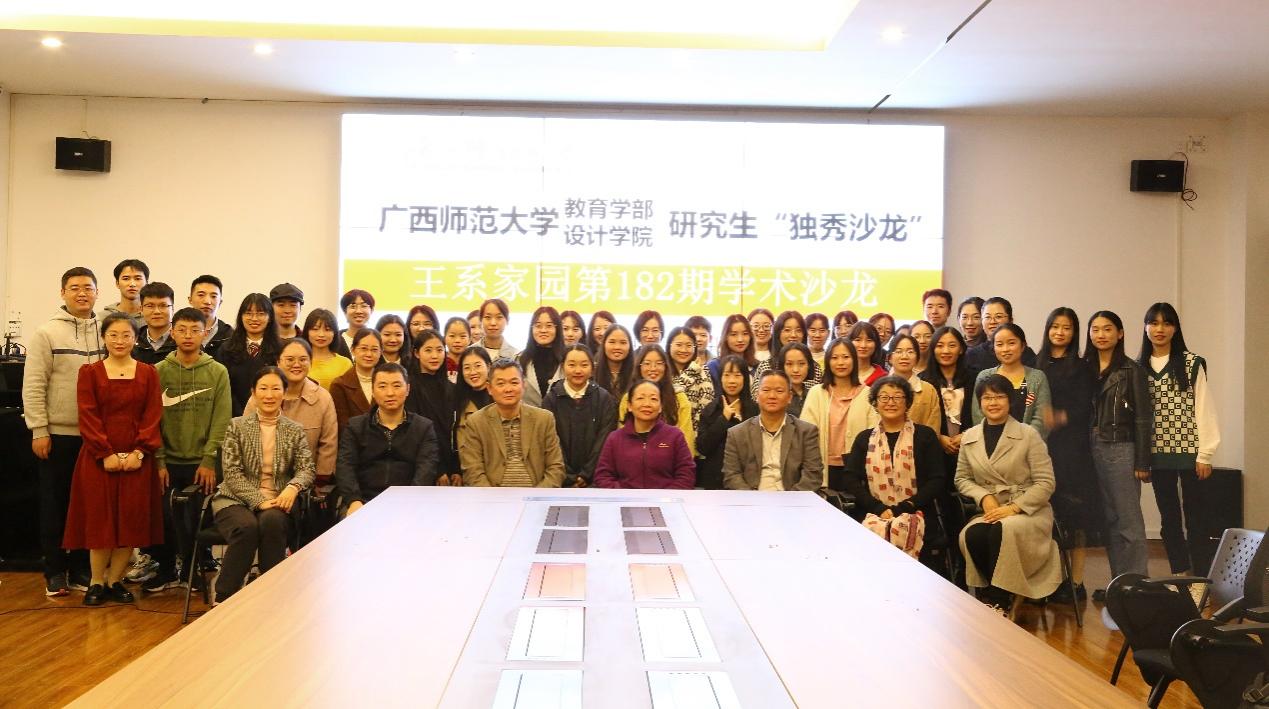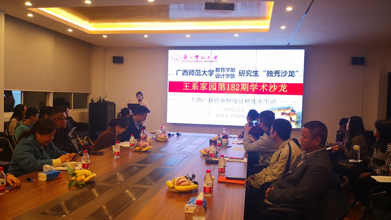 为拓展研究生学术视野,强化研究生学术素养,广西师范大学教育学部长期支持和推进由各位导师带领研究生举办的“独秀研究生”学术沙龙,以经典阅读、新生导学、论文指导、学术研学、社会实践等多种形式对研究生学习施以长程指导和持续陪伴。2021年10月20日晚,学部王枬教授、王彦教授、柳谦副教授以及“王系家园”全体研究生在雁山校区设计学院会议厅举行了主题为“我将如何度过研究生生活”第182期学术沙龙活动。本次沙龙以半开放形式进行,设计学院党委书记白先柱老师、副院长谢青老师、刘世军老师以及来自设计学院的80名师生共同参与了本次活动。