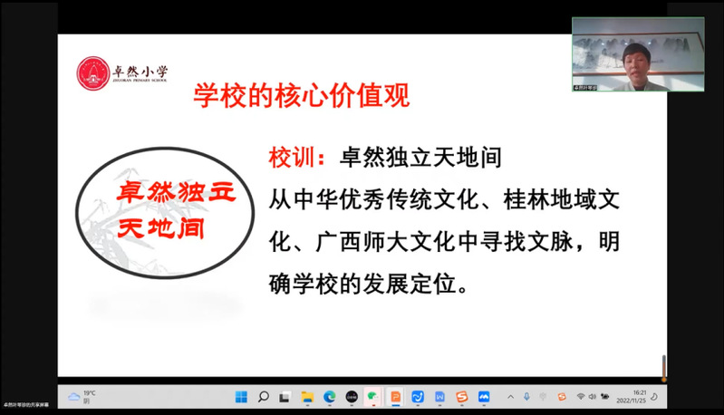 为提升本科生专业发展素养,提升学生的教师职业素养,11月25日下午,教育学部教育学系一流本科(小学教育)专业建设系列讲座第四讲通过线上腾讯会议顺利举行。本次讲座特邀桂林市七星区卓然小学党总支书记、校长,叶琴珍老师带来题为“如何成为卓然教师”的专题讲座。讲座由教育学系副主任卢蓬军老师主持,教育学部小学教育专业200多名师生共同参会。