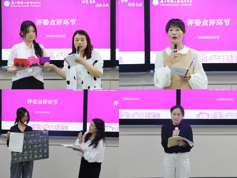 所有赛事结束后,评委老师对选手表现给予充分肯定与专业点拨。桂林市聋哑学校王青副书记和欧阳鑫主任对教学具制作、两笔一画和手语大赛进行点评,桂林市培智学校林东华主任和白崇芳主任对教学试讲进行点评。她们充分肯定了选手们的创新性和专业度,同时也一针见血地指出不足之处,并给出针对性地改进建议。本次比赛展示了学校、学部师范生们扎实的专业素养、创新的教学思维以及对特殊教育事业的热情之情。评委们的精彩点评和专业点拨,也为同学们提升专业素养指明了方向。活动最后,由欧阳鑫主任、白崇芳主任为选手们颁发了三等奖,王青副书记、林东华主任颁发二等奖,熊西蓓副部长和张玲副主任为选手颁发一等奖。