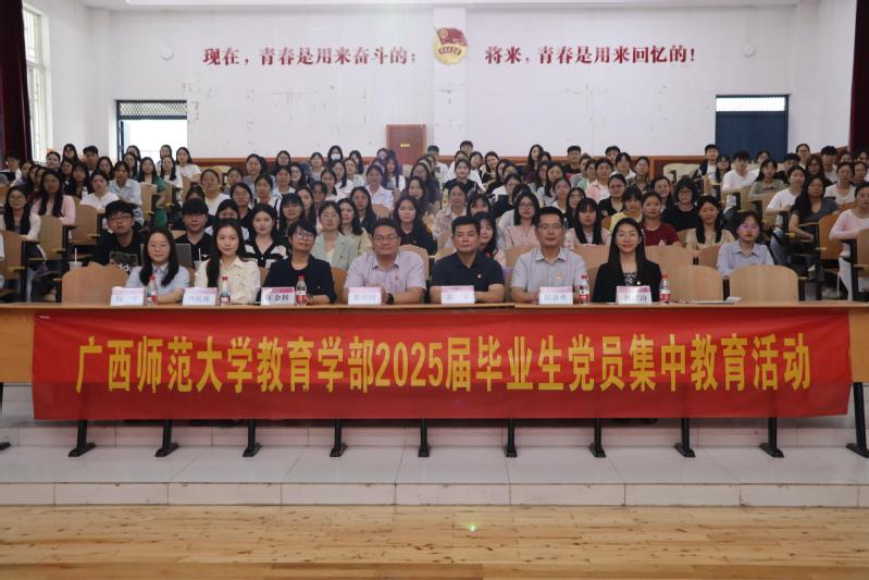 为进一步加强毕业生党员教育管理,引导毕业生党员坚定理想信念,永葆党员先进性,5月29日下午,教育学部党委在雁山校区文二219大学生学术报告厅顺利开展2025届毕业生党员集中教育活动。教育学部党委主要负责人、学生工作主要负责人、各党支部书记、2025届150余名毕业班党员共同参加了本次活动。本次党员集中教育活动由教育学部学生工作主要负责人主持。