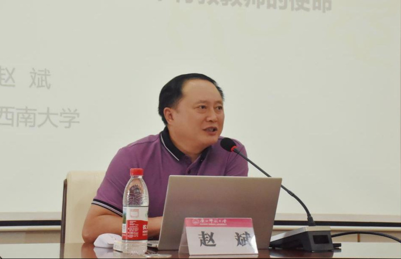 为深入贯彻落实党的二十大、二十届三中全会精神及《教育强国建设规划纲要(2024-2035年)》中的特殊教育发展任务,把握时代赋予特殊教育的机遇与挑战,明确特殊教育教师的专业使命。广西师范大学教育学部特殊教育学专业师生党支部精心策划的“融爱·领航名师大讲堂”第四讲于6月4日在行政北楼第五会议室开讲,西南大学特殊教育学院院长赵斌教授以“特殊教育发展趋势与未来特教教师使命”为题,为师生带来一场兼具思想深度与实践温度的专题讲座。