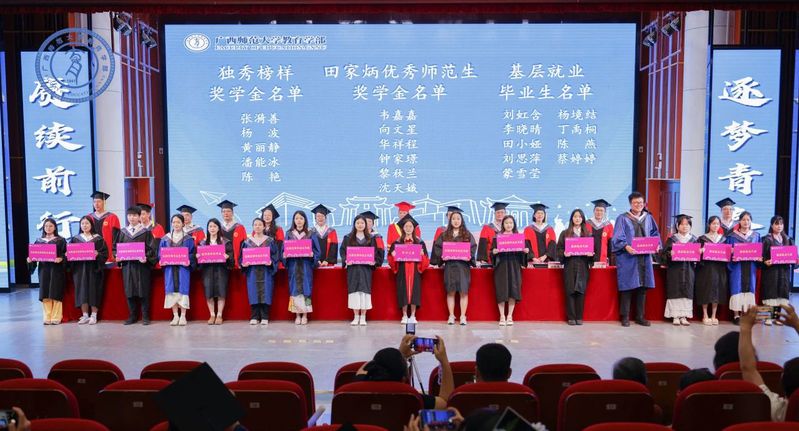 校党委副书记、校长兼教育学部部长孙杰远教授以及学部导师团为学部2025届立志服务基层的毕业生、荣获自治区优秀毕业生、升学深造、学术卓越、校长奖学金和独秀榜样奖学金获得者的毕业生们表彰并颁奖,他们展现了该届毕业生积极向上、奋发图强的精神风貌。随后,学部导师团为学部2025届博士毕业生、硕士毕业生、本科毕业生拨穗及授予学位,并与每一位毕业生合影留念。