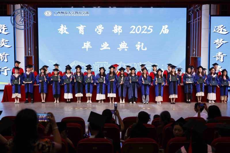 6月19日上午10:00,广西师范大学教育学部2025届毕业典礼在雁山校区音乐学院三楼演艺厅举行。校党委副书记、校长兼教育学部部长孙杰远教授,教育学部党委主要负责人、教育学部学位评定委员会、各系主任、教师代表及部分毕业生家长出席典礼。教育学部党委副书记主持本届毕业典礼。