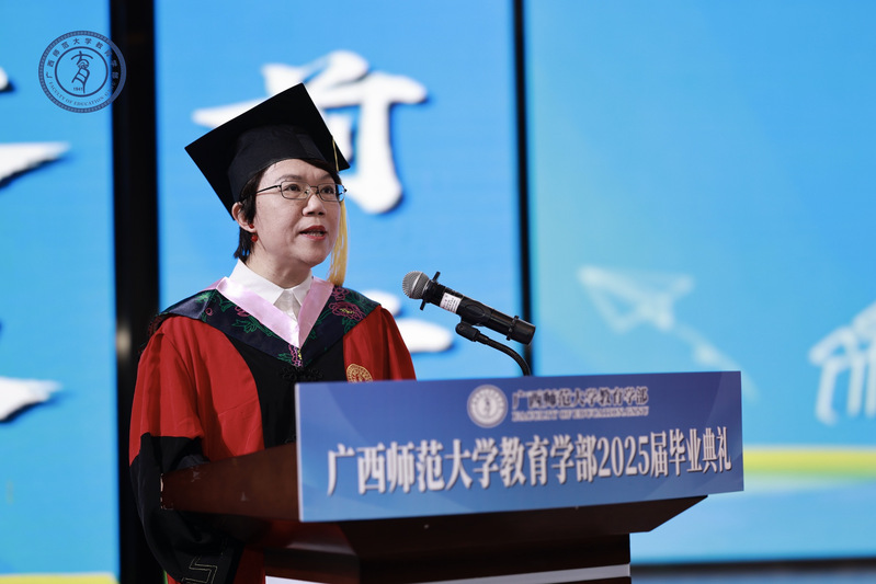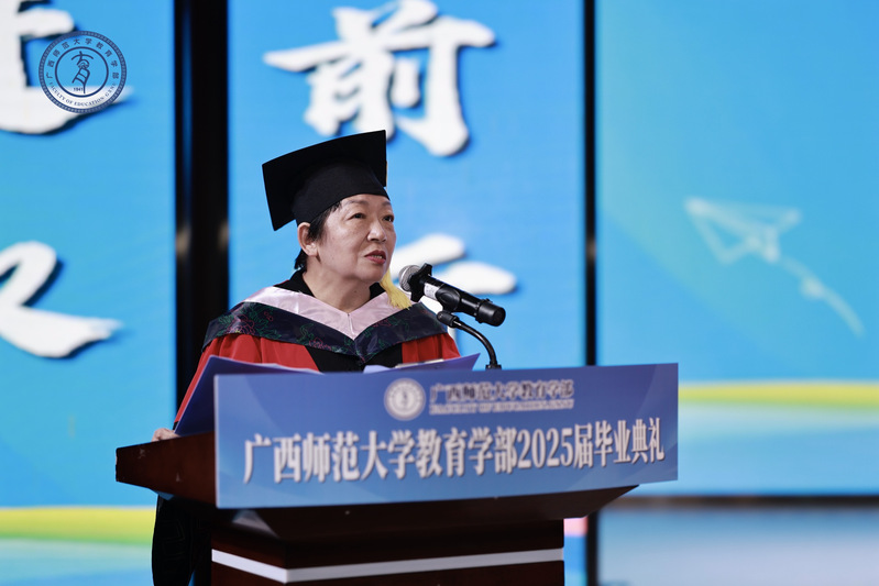 广西师范大学二级教授、教育学部博士生导师王枬教授作为教师代表发言。她强调教育学是研究如何培养人自觉性的学问,充满并创造希望。她指出广西师范大学教育学部的毕业生,教育学已成为他们的身份标志,学部是他们精神成长的沃土。她认为,教育学的首要意义在于成人成己,其次是育己育人,强调其在教育强国建设中的重要性。第三,教育学帮助人们在人工智能时代重新审视价值观,寻找人的本质。她鼓励毕业生们以生命为本,实践为方法,致力于教育事业,享受教育学研究的丰富与魅力。