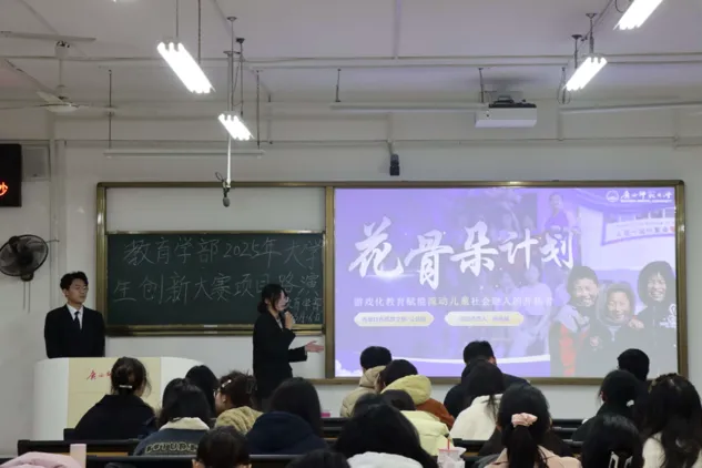 近日,广西师范大学教育学部大学生创新大赛项目路演在雁山校区文一109、110教室隆重举行。此次活动由广西师范大学创新创业协会教育学部分会主办,旨在激发大学生的创新创业热情,提高创新创业能力,并为广大学子提供一个展示自我、交流学习的平台。活动吸引了来自教育学部的30支晋级队伍及100多名观众参与,现场气氛热烈,创新思维碰撞出耀眼的火花。活动邀请到教育学部学生工作主要负责人、教师代表,创新创业学院以及经济管理学院老师担任大赛评审。嘉宾们的到来为活动增添了更多专业性和权威性,也为参赛队伍提供了宝贵的指导和建议。