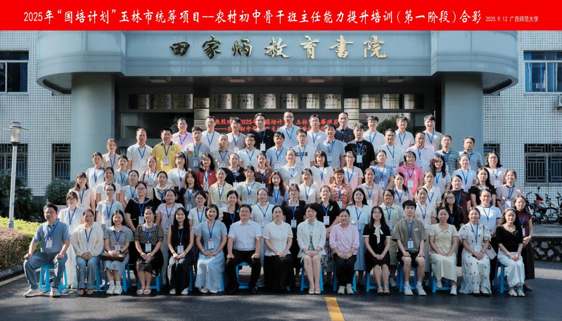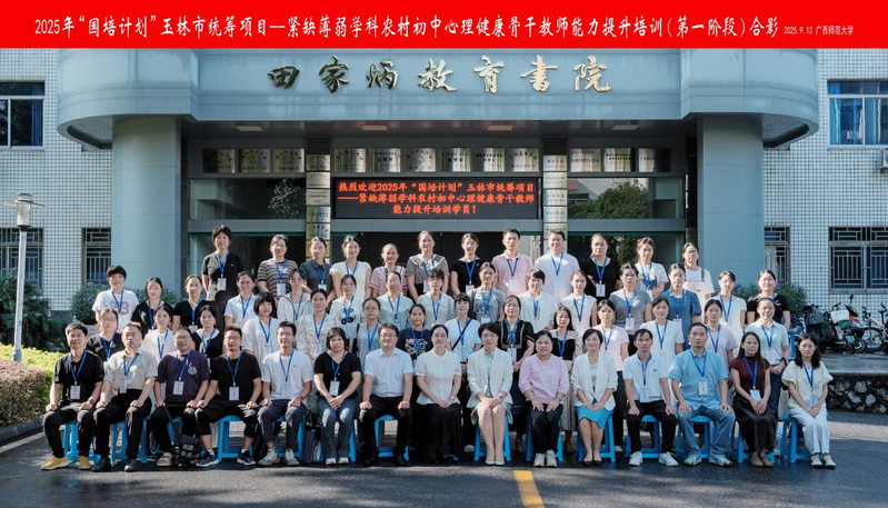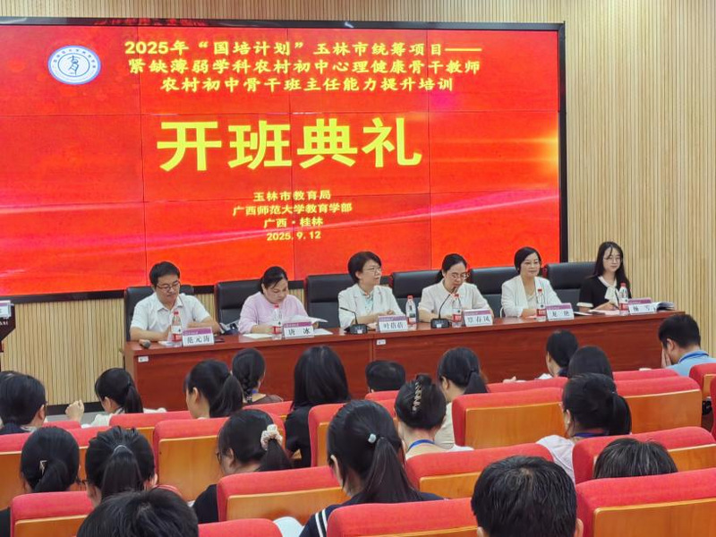 为深入贯彻落实国家关于新时代教师队伍建设改革的决策部署,提升农村初中骨干班主任和心理健康骨干教师的专业能力与综合素养,2025年9月12日,由玉林市教育局统筹、广西师范大学承办的2025年“国培计划”紧缺薄弱学科农村初中心理健康骨干教师暨农村初中骨干班主任能力提升培训开班典礼在广西师范大学田楼102报告厅举行。玉林市教育局副局长覃春凤,玉林市教师培训中心副主任唐冰,广西师范大学教育学部常务副部长、广西基础教育研究院副院长叶蓓蓓教授,两个培训班的教学班主任、生活班主任以及来自玉林市各县市区的130名培训学员共同参加了开班典礼。开班典礼由广西师范大学教育学部社会服务事业部副主任范元涛博士主持。