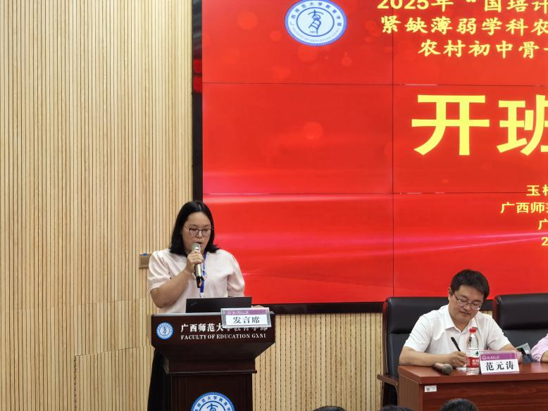 玉林市教育局覃春凤副局长出席典礼并致辞。她强调:教师是立教之本、兴教之源,加强农村教师队伍建设是推动教育公平、提升教育质量的关键举措。希望全体学员要转变角色、潜心学习、深入思考、积极交流,努力将培训成果转化为实际教育力,发挥骨干教师的示范引领作用。