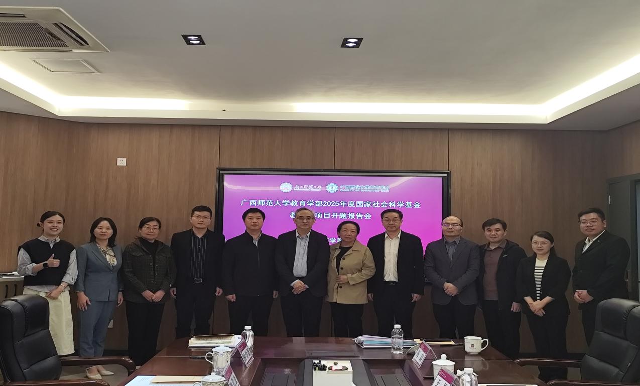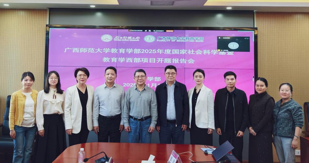 近日,广西师范大学教育学部2025年度国家社会科学基金教育学项目集中开题报告会顺利举行。广西师范大学党委常委、副校长宋树祥,广西师范大学教育学部常务副部长叶蓓蓓,广西师范大学社会科学研究处副处长钟学思出席报告会。报告会分为两场,分别邀请了华东师范大学范国睿教授、华中师范大学郭元祥教授、广西师范大学王枬教授、东北师范大学秦玉友教授、中央民族大学海路副教授,中国教育科学研究院吴霓研究员、中国教育科学研究院张冲研究员、华东师范大学邓猛教授、陕西师范大学王庭照教授、广西教育研究院谢凌凌教授作为专家组成员出席,范国睿教授和吴霓研究员分别任两场开题报告会专家组组长。各项目组及学部师生40余人参加了本次报告会。