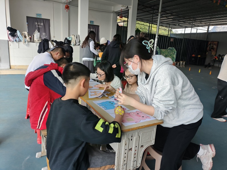 活动前,志愿者们结合专业所学,针对特殊儿童的身心特点,精心设计了八个趣味盎然的游园项目。当日下午,阳朔特校的校园化身为一座充满欢声笑语的“乐园”。“钓鱼大作战”区内,孩子们专注地用磁力钓竿“捕获”池中的彩色小鱼,锻炼手眼协调能力;“动物森林会”中,他们模范青蛙跳荷叶、猴子扔桃,让整个身体“动”起来、“活”起来;“黏土美食坊”里,五彩的黏土在稚嫩的手中变成了各式各样的美食,创意飞扬;而“兔子舞律动闯关”则让整个游园区活力四射,孩子们跟着音乐节奏跳跃,完成挑战。此外,还有“穿越奇幻森林”“”、“厨房小帮手”等小组活动同步开展,形式多样,内容丰富。孩子们在志愿者一对一的耐心引导与鼓励下,兴致勃勃地穿梭于各个站点,每完成一个游戏,便收获一枚贴纸或小零食,脸上洋溢着自豪与快乐的笑容。游园活动结束后,志愿者们分组进入班级,与孩子们进行了更深入的互动交流,并同特校的一线教师就特殊学校学生的日常教学、行为支持及家校共育等话题进行了探讨。志愿者们将课堂理论带入真实情境,深切体会到了特教工作的细致与不易,也从孩子们纯真的反馈与教师们的经验分享中获得了宝贵的启示。