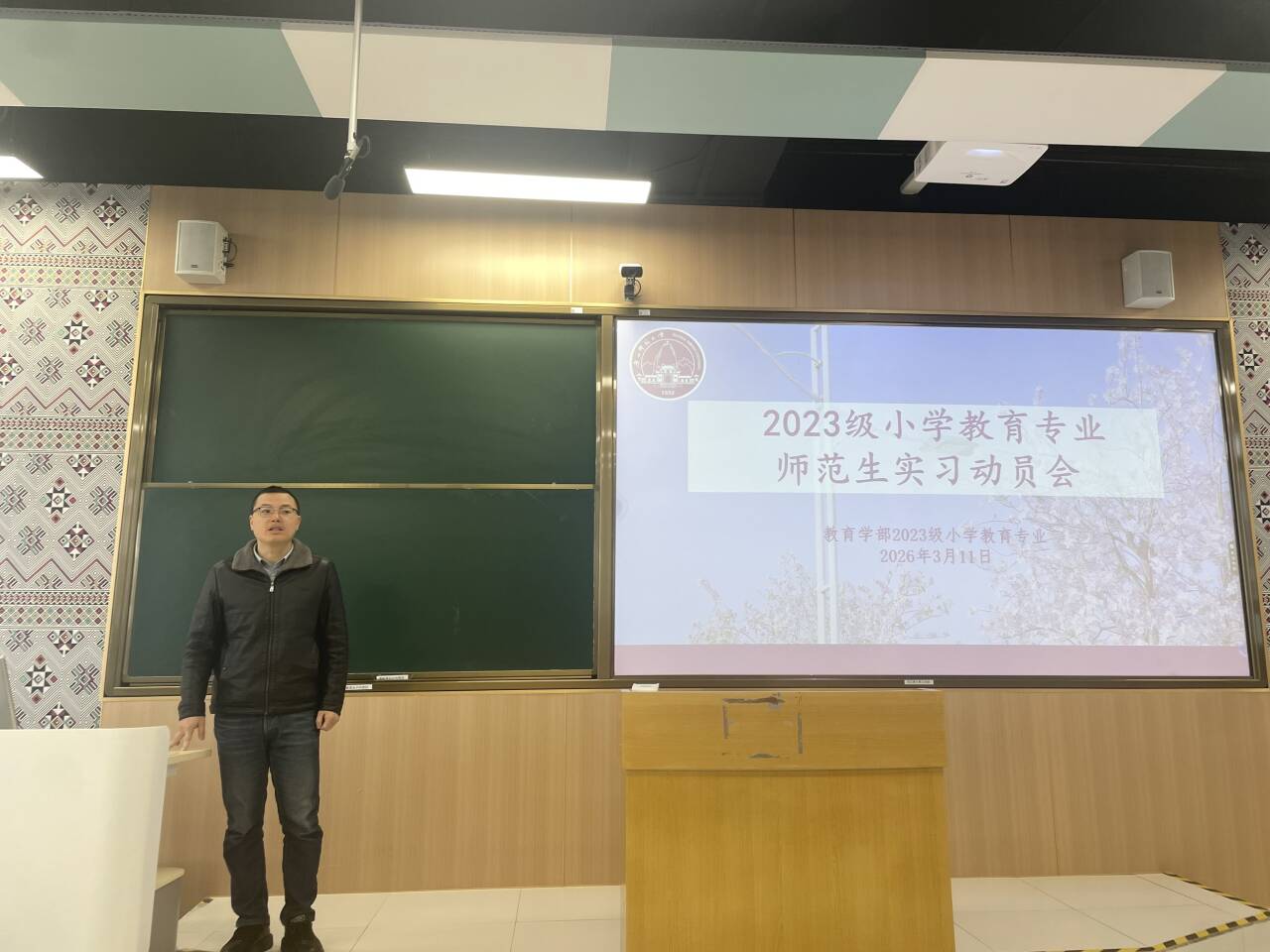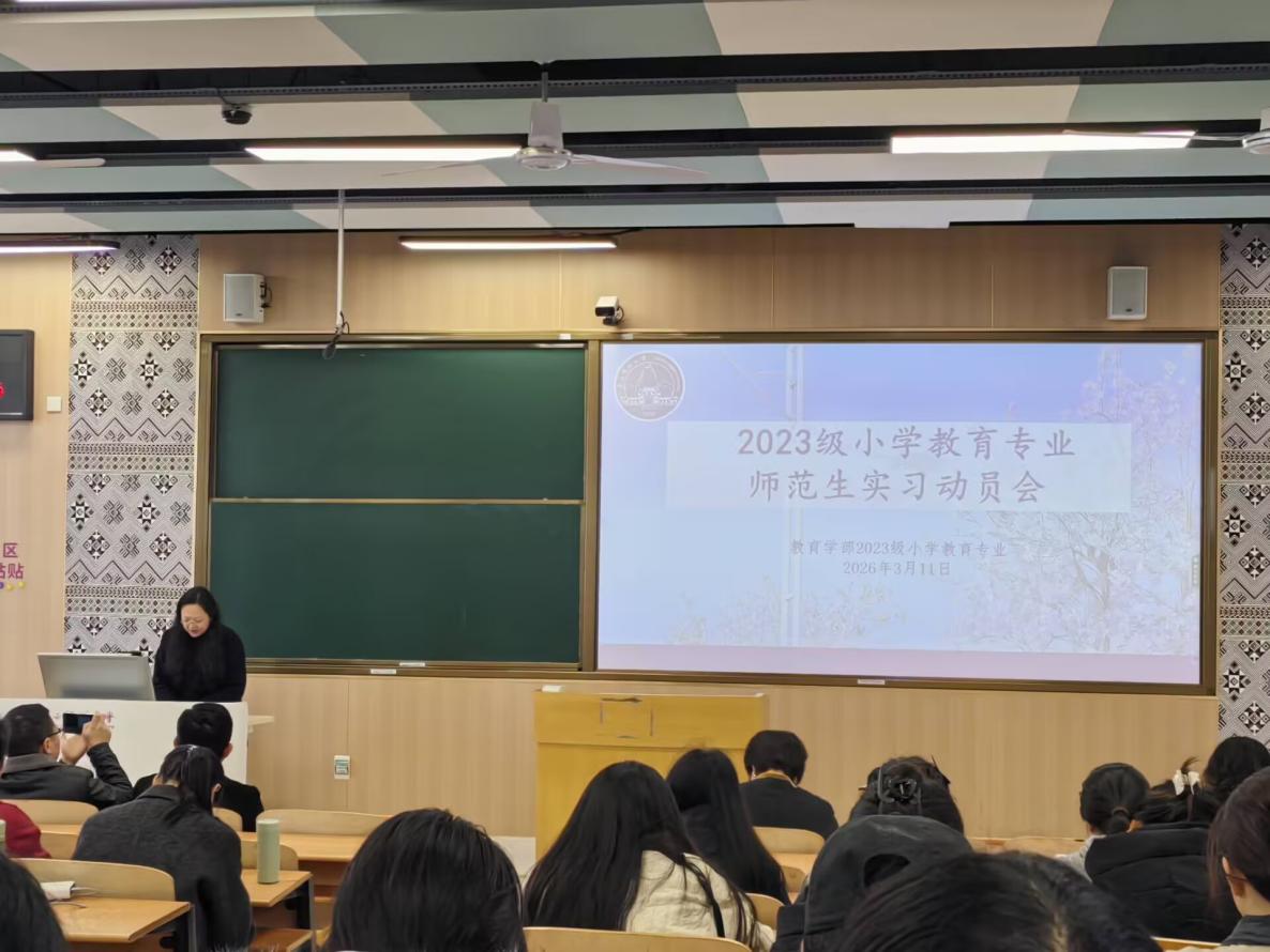 春风拂柳绿,实践蕴师魂。3月11日上午,广西师范大学教育学部在雁山校区文四104教室隆重召开了2023级小学教育专业实习动员大会。教育学部常务副部长叶蓓蓓、副部长熊西蓓、学部党委副书记苏宝、教育学系主任邓文勇、各实习带队指导教师悉数出席,与2023级小学教育专业全体本科生齐聚一堂,共话教育实践的初心与使命,为同学们即将开启的实习征程凝心聚力,保驾护航。