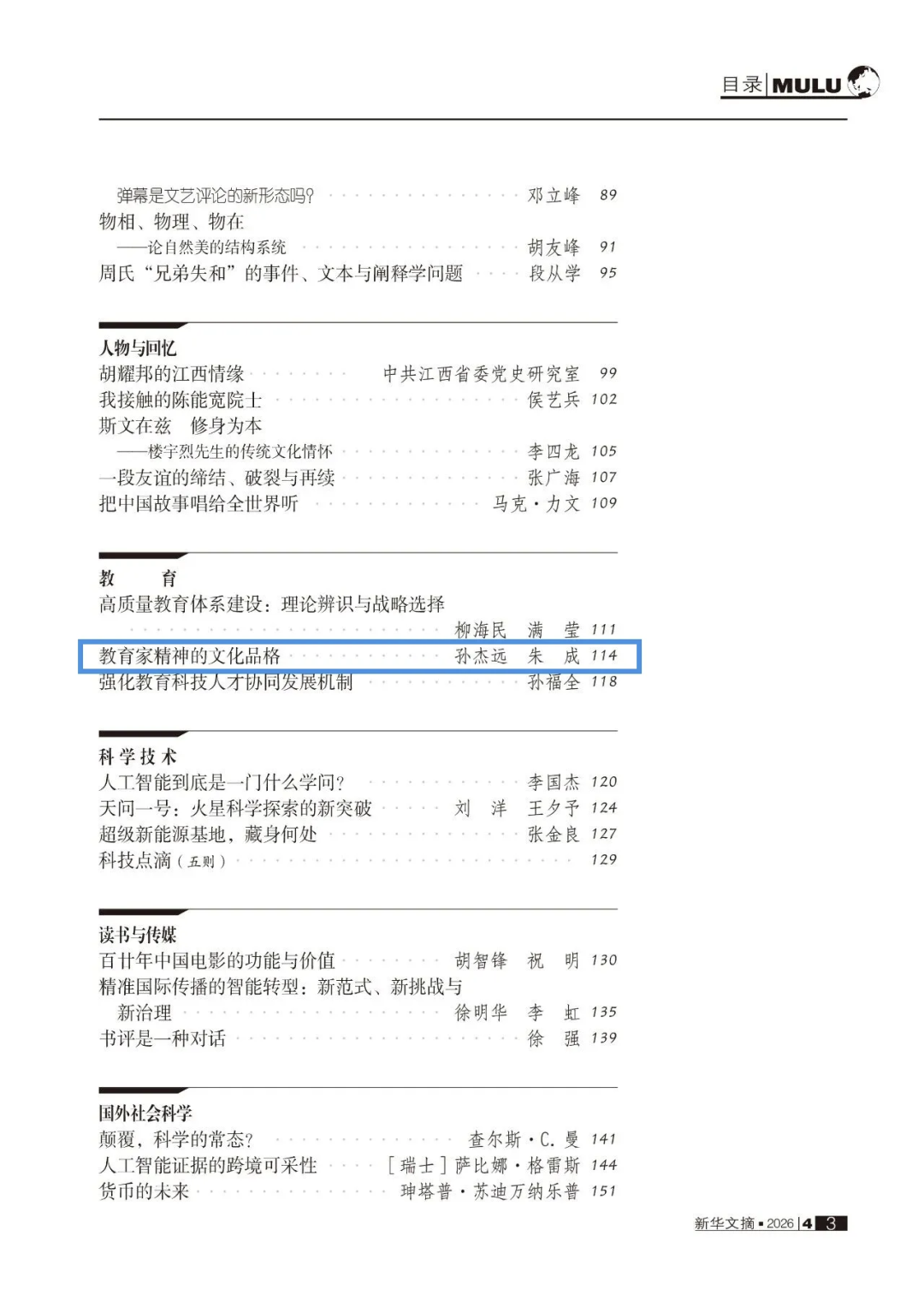 《教育家精神的文化品格》(作者:孙杰远、朱成)被《新华文摘》2026年第4期「教育」栏目全文转载。